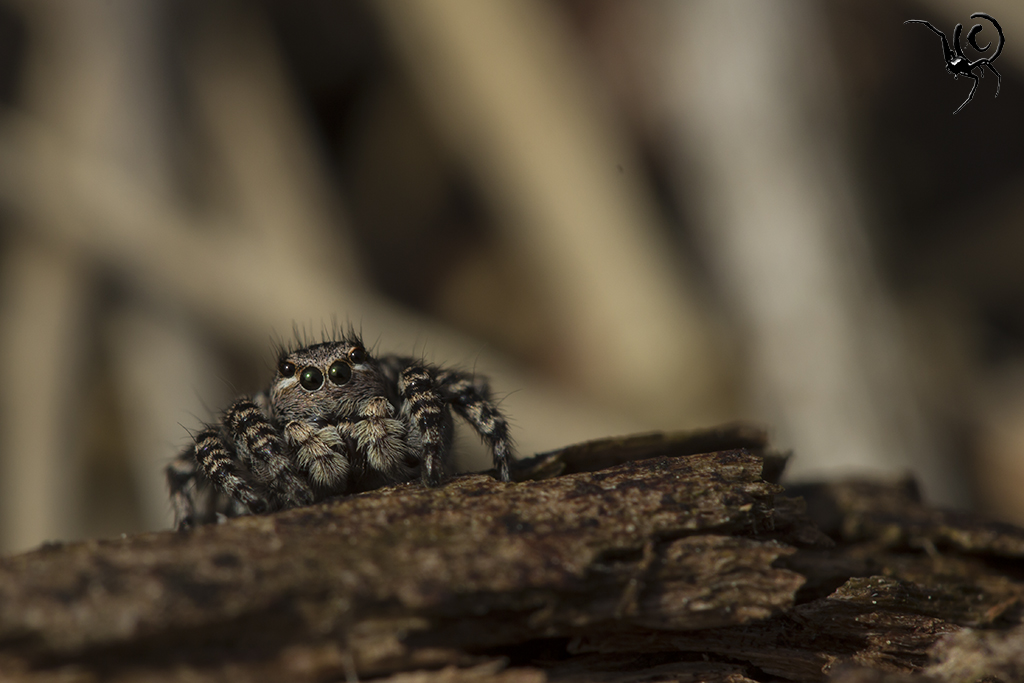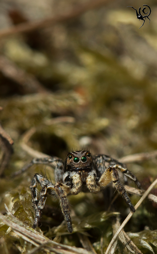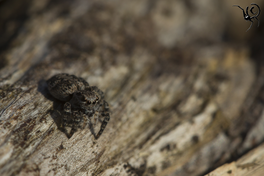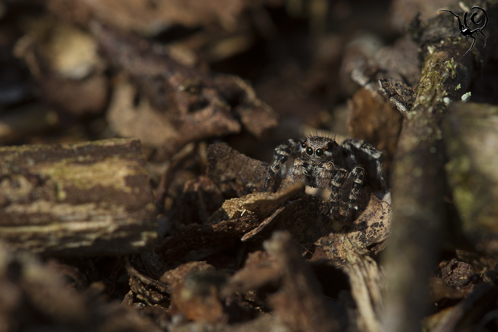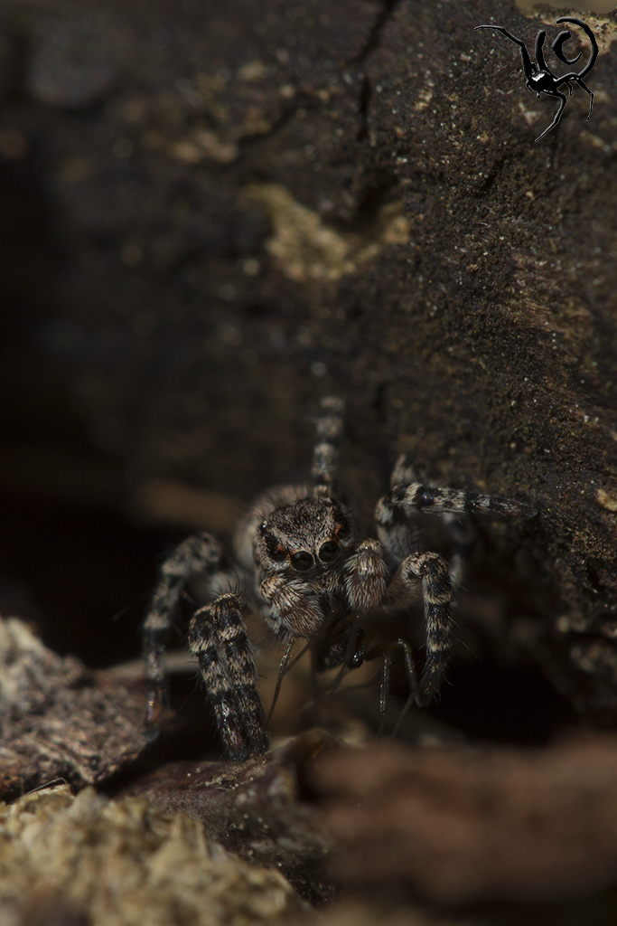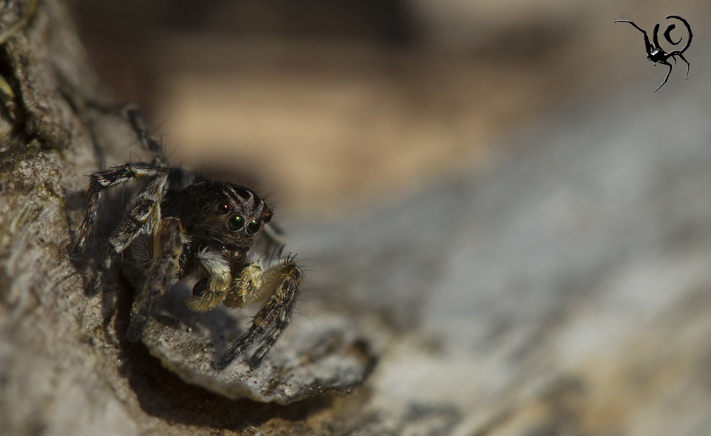 Zo’n ‘mini-biotoop’ is voor veel dieren belangrijk, met name geleedpotigen. Sommige soorten hebben baat bij een zonnige plek, andere weer bij meer schaduw of vocht. In dit geval waren er wel wat insecten te vinden maar wat ik veel leuker vond waren de spinnen die er rond aan het springen waren. Springspinnen (Salticidae) behoren tot mijn favorieten, zowel qua gedrag als qua uiterlijk. In dit geval betrof het een groot aantal (>30 dieren) V-vlek springspinnen – Aelurillus v-insignitus. Deze dieren zijn erg visueel ingesteld en zijn continue bezig met elkaar in de gaten houden. Als ze elkaar in het vizier hebben seinen ze naar elkaar met trillende achterlijfjes en zwaaiende pootjes, ik kan er uren naar kijken. Veel mensen hebben het filmpje van een baltsende peacock-spider wel eens gezien (zo niet, klik hier) en dit gedrag lijkt er veel op. Niet zo’n felle kleuren en geen dansjes maar toch hele mooie beestjes, oordeel zelf;