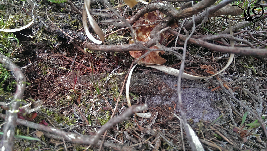 Nou is de heide in Hapert niet heel erg vlak. Er liggen wat heuveltjes in het landschap wat voordelen met zich meebrengt. Sterker nog, de heuvels liggen van oost naar west waardoor er dus een groot gedeelte op het zuiden gericht staat. Dat betekend dus dat hier voor een groot gedeelte van de dag de zon op staat. Dat houd in dat deze heuvels lekker warm worden en een ideale plek voor de Mijnspin (Atypus affinis) is om te leven. Mijnspinnen zijn aan hun naam gekomen doordat ze in een buisvormig web leven wat gedeeltelijk boven de grond zit. Dit web is gecamoufleerd met zand, schors, steentjes en mos en heeft wat weg van een mijnschacht. Hierdoor zijn het dus spinnen die erg lastig zijn om te spotten. Vaak worden alleen in het najaar (september- oktober) volwassen mannetjes gezien, op zoek naar vrouwtjes. Deze kerels overleven een paring niet altijd maar het kan ook zijn dat ze overwinteren bij het vrouwtje en in het voorjaar nog gespot worden. Het enige wat soms opvalt is een vers uitgegraven holletje waardoor er wat zand naast de woonbuis ligt…