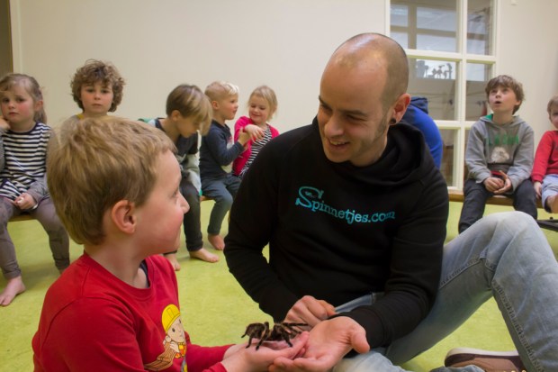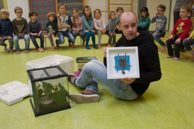 Ik vind het heel erg leuk om over dieren te praten en in het bijzonder spinnetjes, dat blijven mijn all-time-favorites! Daarnaast vind ik bijna alle andere dieren ook te gek, alleen ik vind muggen iets minder maar daar maken ze het zelf ook naar. Het allerleukste is natuurlijk om onze jongste medemens ook kennis bij te brengen over dieren want jong geleerd is oud gedaan. Er bestaan een heleboel misvattingen over spinnen en als ik dat in de kiem kan smoren wil ik die kans niet laten liggen. Begin maart ben ik met een aantal dieren langs gegaan bij een supertoffe BSO in Breda genaamd Open up! Fun Kidz om mezelf én een aantal dieren voor te stellen. Bijna veertig kinderen waren dolenthousiast want er zou niet alleen een spin mee komen dit keer! In het midden van het gebouw waarin de BSO zit is een gymzaal waar alle kinderen bij elkaar verzameld werden voor de uitleg. Enigszins gespannen komen de kinderen één voor één binnen druppelen om zien wat er komen gaat…