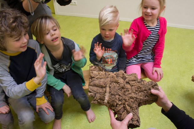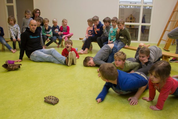 Om aan te geven dat er meer dieren zijn met een stevig skelet mocht deze Russische vierteenschildpad even mee naar Breda, al rondwandelend liet hij zien best behendig te zijn met dat schild om hem heen. Dat schild is gevormd door ribben die aan elkaar gegroeid zijn en daar overheen zit huid net als bij ons. Dat deze huid wél mee groeit kon je dan weer zien aan de “jaarringen” op z’n schildje. Uiteindelijk was het een gezellige en zeer geslaagde middag waarbij de kinderen lol hebben gehad en stiekem ook nog iets hebben geleerd. Win-win situatie 🙂