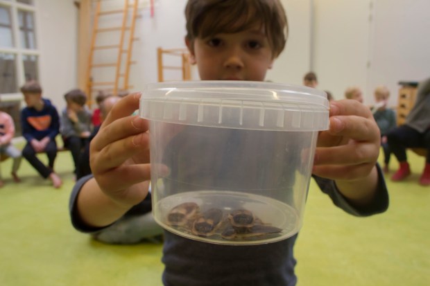Om een klein beetje los te komen heb ik ook wat dieren meegenomen die wat laagdrempeliger zijn; kakkerlakken! Haha, die hadden ze niet aan zien komen 😀 maar ik had ze wel echt bij. Om de verschillen uit te leggen tussen insecten en spinnen is het wel makkelijk om ook een insect bij te hebben. Een kleine vijftig in een bak bij elkaar wat lekker krioelt maar lastig uit elkaar te houden is. Twee kinderen mochten dan ook assisteren bij het “hanteren” van de dieren om aan iedereen te laten zien; één bakje met mannen en één met vrouwtjes.